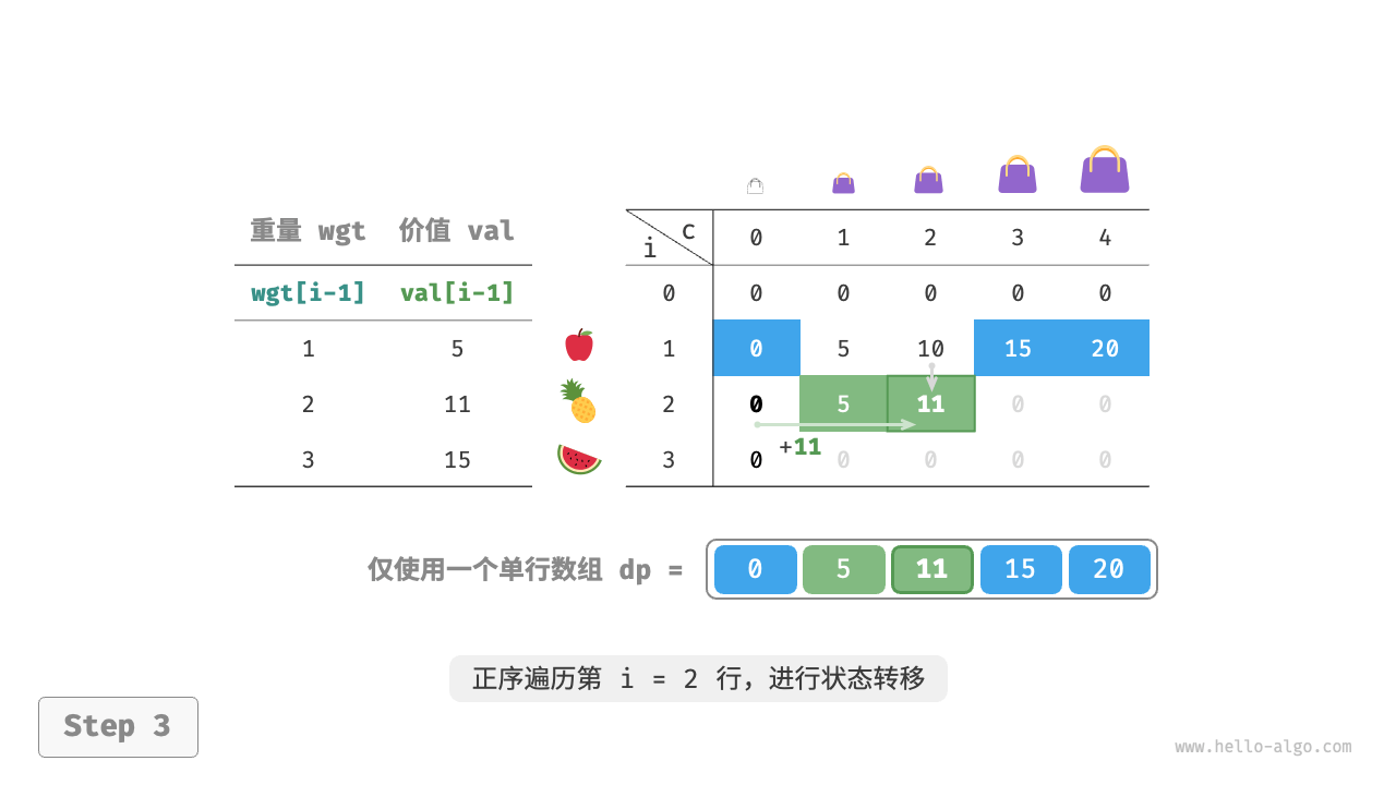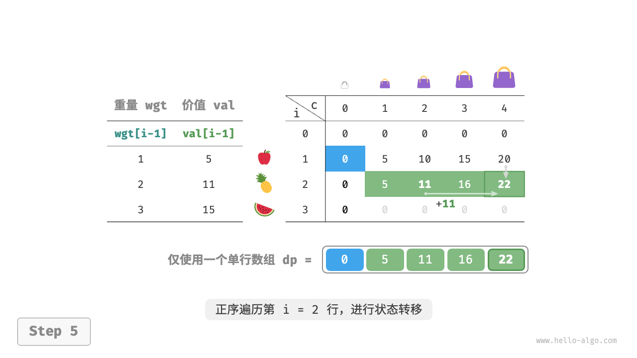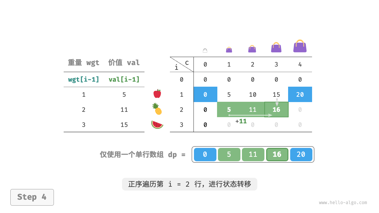 这个遍历顺序与 0-1 背包正好相反。请借助下图来理解两者的区别。