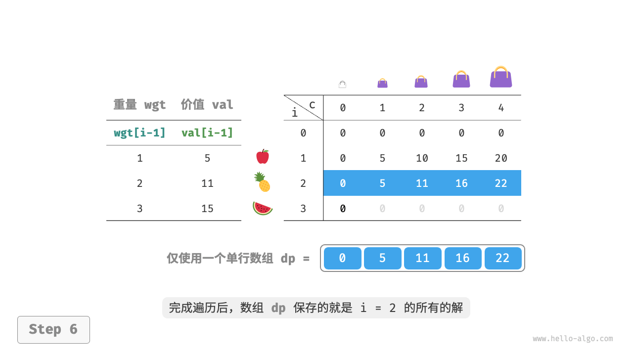 - 在 0-1 背包问题中,每种物品只有一个,因此将物品 \(i\) 放入背包后,只能从前 \(i-1\) 个物品中选择。